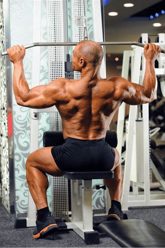 The lat pulldown exercise works the back muscles and is performed at a workstation with adjustable resistance, usually plates.